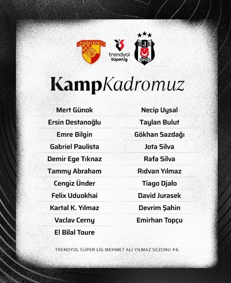 Siyah-beyazlı kulübün sosyal medya hesabından yapılan paylaşımda kamp kadrosu açıklandı. Rashica, Svensson, Ndidi, Salih Uçan ve Mustafa Erhan Hekimoğlu kadroda yer almadı. Genç oyuncu Devrim Şahin kadroda yer aldı. Beşiktaş’ın Göztepe maçı kamp kadrosu şu şekilde;